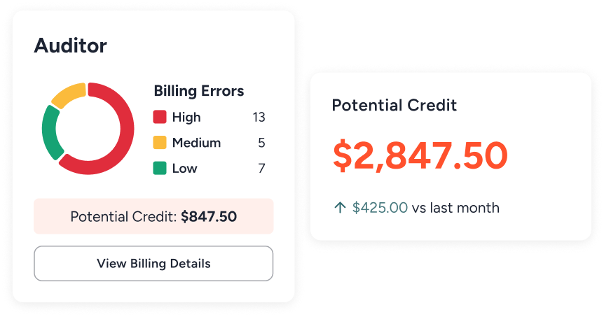 Intelligent auditing catches billing errors, unauthorized charges, and contract discrepancies that could cost your business thousands annually.