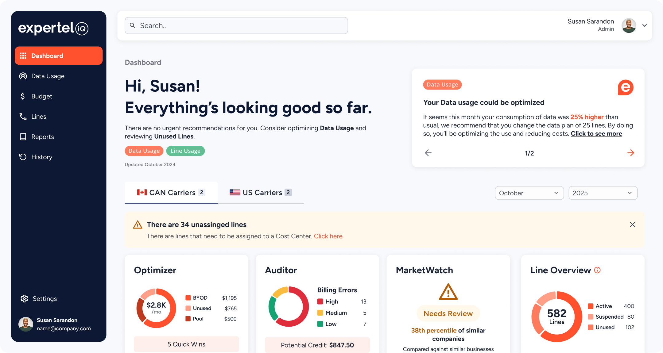 The Expertel iQ dashboard gives you a clear, easy-to-read overview of your current wireless usage and spending. Select the savings recommendations and invoice changes you want to make with just one click.